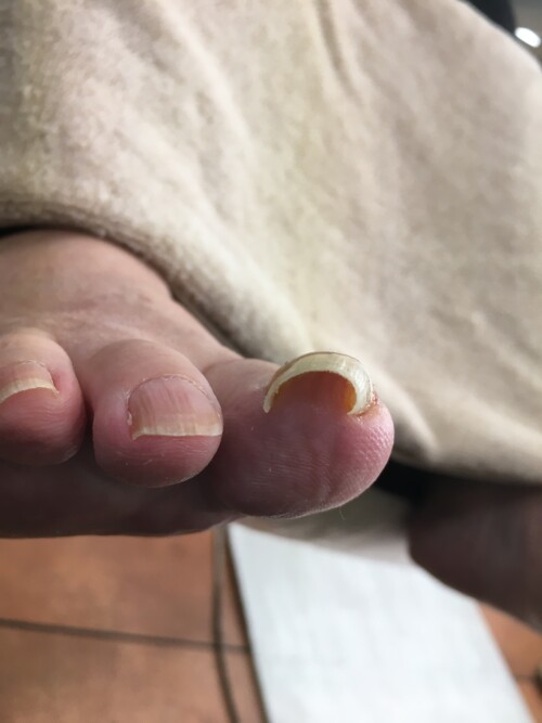 爪を見てみると・・・上の写真ようにしっかりと爪が巻いてあり、見ているだけでこちらも痛くなる巻き爪でした。